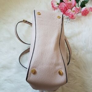 In excellent condition with very minor wear! Light/pale pink, does have very minor flaws: stain on top near zipper see last photo, very light multiple pockets, inner zipper, main zipper, removable adjustable crossbody strap, pretty clean in the inside, pebble leather, gold hardware, gold feet studs.