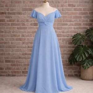 Azazie dusty blue chiffon bridesmaid gown in size A10. Features a ruched sweetheart bodice with twist detail and soft flutter sleeves. Flowy floor length skirt with back zipper closure. Fully lined. Lightweight and elegant for weddings, formal events, prom, or black tie occasions.