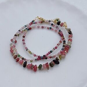 Colorful and versatile, this handmade **2-in-1 piece** can be worn as a **triple-layer bracelet** or a **necklace**. Crafted with natural **rainbow tourmaline** beads and finished with **gold-plated accessories**, it adds vibrant elegance to everyday looks or layered styling.