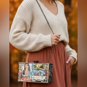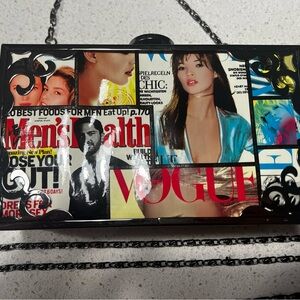 This unique novelty purse features soft clear vinyl/PVC over bold magazine collage panels, a structured framed body, and TWO different metal chain straps so you can wear it as a shoulder bag or crossbody.