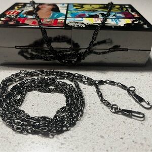 • Two interchangeable gun metal chain straps (different lengths) one is long at 46.5” from end to end one is 15” long
