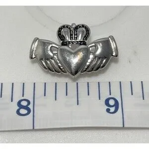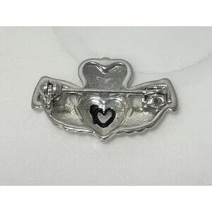 Vintage silver tone Claddagh brooch featuring the traditional crowned heart held by two hands, symbolizing love, loyalty, and friendship. The crown has black enamel detailing, giving the piece nice contrast against the polished silver tone finish.