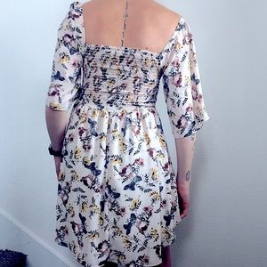 Beautiful flirty dress with elastic smoked bodice these are New I have a Juniors Small & Large Floral design on a pinkish cream colored background updated casual mid wide sleeves