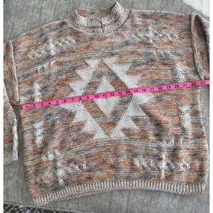 Soft and warm multicolor sweater featuring an intricate Aztec-inspired design. Durable knit material with a relaxed fit for comfort and style.