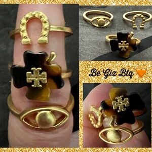 Tory Burch Stackable Ring Set Brand New One rippled station ring, one Tortoise resin with T Logo ring, and one ring with good luck symbols. Tory Burch Jewelry Rings