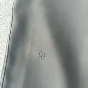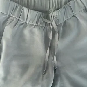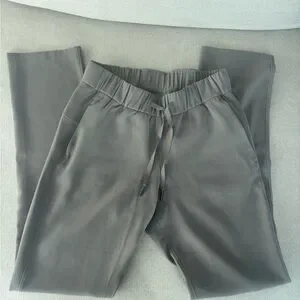 Grey flared track pants. Stretchy waistband that ties. There is some pilling and a pull (see pictures).