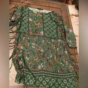 Zara Green & Multi Color Design Tunic Top Casual Dress High round neckline & Long sleeves with side fringe.
