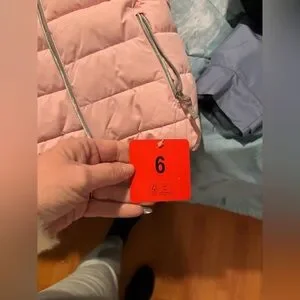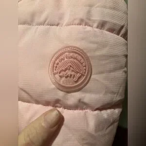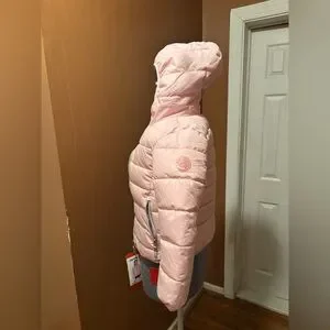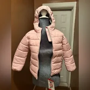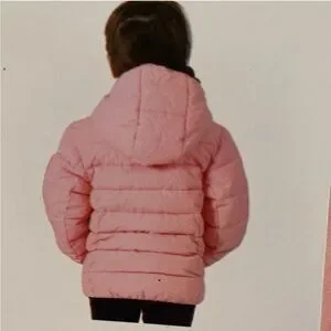 Charming light pink puffer coat. Includes a cozy hood and secure front zipper. Ideal for warmth and style.