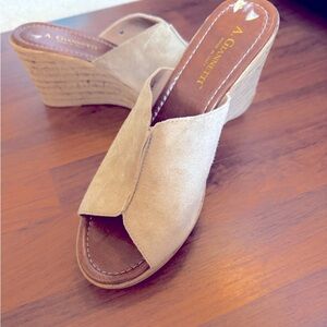 A.Giannetti, Italian, made in Italy, cork, wedge, suede, tan, leather, sandal, summer, summertime, vacation, travel, cruise, boho, bohemian, indie, coastal, coastal grandma, festival, hippie, casual, neutral, natural