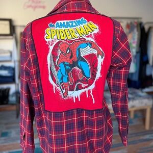 Upcycled Flannel w/ Vintage Graphic Tee Back Patch – Reworked Shirt. See photos for details and measurements.