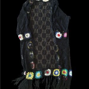 Elevate your boho style with this stunning ASHA black lace kimono featuring vibrant multicolor crochet granny square trim and fringe hem. Perfect for layering over tanks, dresses, or as a chic beach cover-up.