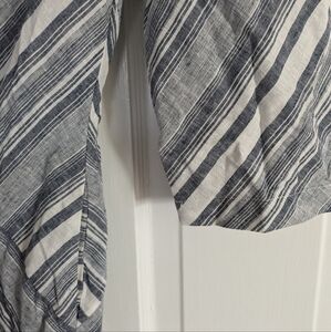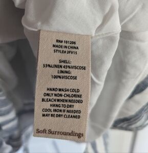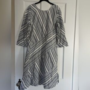 Soft Surroundings blue and white stripe patchwork dress. Two pockets! 3/4 sleeves and scoop neck. Fully lined. 55% linen and 45% viscose. NWT.