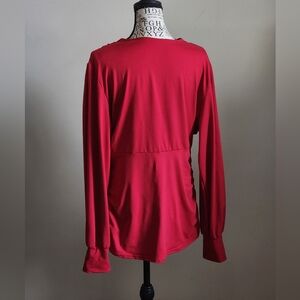 This extra soft fabric elegant red V-neck top is perfect for any occasion. Its stylish design offers both comfort and sophistication, hugging / scrunching in all the right places, this ruched top is great for elegant to whimsical outfits. The color is red, in natural lighting the camera makes it look a little pinker than it does in person. The pit to pit measurement is 21", the waist measurements is 16" but there is alot of stretch due to the scrunched fabric on the sides.