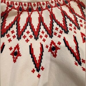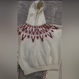 Cream sweatsuit with red and blue southwestern style embroidery on front and back of sweatshirt down sleeves and down the sides of the sweatpants