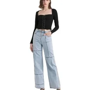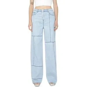 Chic straight leg jeans in light blue. Features unique seam detailing. Perfect for casual wear.
