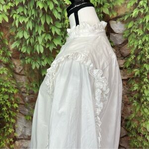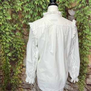 SEO: J.Crew white blouse, cotton ruffle top, Victorian inspired blouse, romantic white shirt, quiet luxury blouse, ruffle sleeve top, high low hem blouse, size medium women’s blouse