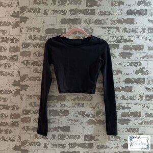 Super comfy cropped work-out long sleeve. It's made from Everlux, so it feels very soft to the skin while also managing heat and sweat. It has little thumb holes as well! I love this shirt! No size tag, but it fits like an XS or 2.
