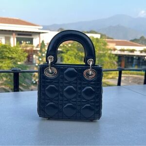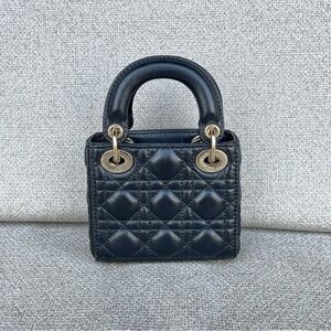 The Lady Dior micro bag embodies the House's vision of elegance and beauty. Crafted in black lambskin with Cannage topstitching, the iconic silhouette is embellished with D.I.O.R. charms. The Lady Dior bag can accommodate all the small essentials and features top handles and an adjustable, removable strap, allowing it to be carried by hand, worn over the shoulder or crossbody.