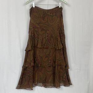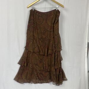 Lauren Ralph Lauren skirt womens 12 in a brown paisley silk chiffon, a tiered midi A-line style for dressy boho outfits.