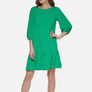 DKNY Women's Ruffled-Hem Balloon Sleeve Crewneck Dress Green Sz 6 NWT