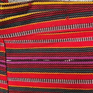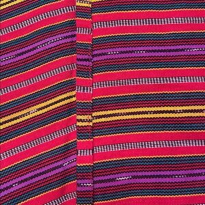 Vintage Striped Multicolor Wrap Skirt; used and worn a lil bit more than a few times. Vibrant with multiple colors and stripes. Features red, pink, yellow, and black hues. Perfect for a bold look. Item does not have a label tag so size is unknown size seems like a size Small/ Medium. The item does not have any stretch to it. The item also has some wear and tear such as knicks and loose threading as seen in photos. Other than the wear and tear mentioned the skirt has a lot of life left. Really good quality.