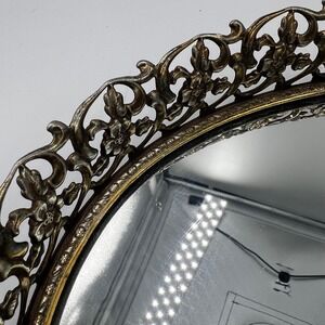 etched mirror tray, hand engraved mirror, vintage brass tray, Hollywood Regency