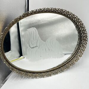 Vintage Hand Etched Brass Mirror Vanity Tray 1988 Dog Shih Tzu Glam