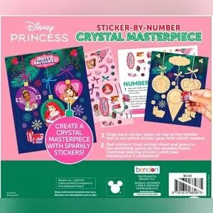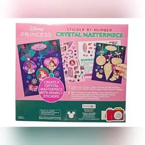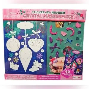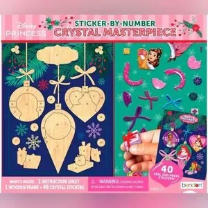 Your little artist can create a mini masterpiece with Bendon's Disney Princess Sticker-By-Number Crystal Masterpiece! Follow the key to match the sparkly stickers to a number on the wooden frame to reveal a beautiful portrait worthy of any wall. Makes a great gift or stocking stuffer for the little artist in your life! It includes a wooden frame, 40 peel-and-press crystal stickers, and an instruction sheet. Designed for children ages 3 and up, with a warning for choking hazards.