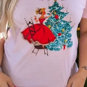 Vintage pink t-shirt with a 'Merry & Bright' graphic featuring a festive design.