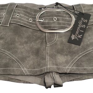 your way or the highway. This micro mini skort has a washed vegan leather construction, contrast colored stitching, a low rise fit, and a statement front buckle closure.