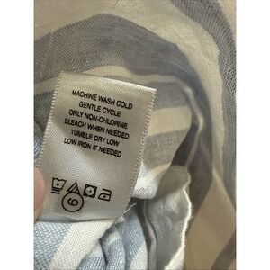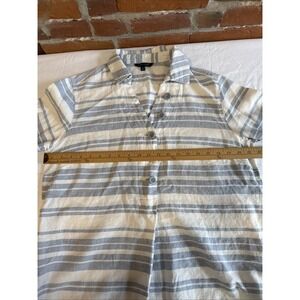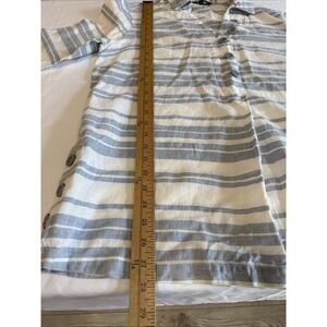 The John Mark 100% Linen Button Blouse is a versatile and stylish piece perfect for various occasions such as travel, casual outings, and business meetings. Made from lightweight woven linen fabric, this multicolor striped blouse features a collared neckline, long sleeves with roll tab details, and a relaxed fit. Ideal for the summer, fall, and spring seasons, it exudes a coastal resortwear vibe with a touch of artsy charm. The button closure adds a nice accent to this tunic-style blouse from the reputable brand John Mark. Perfect for those who enjoy a blend of comfort and style in their clothing choices.