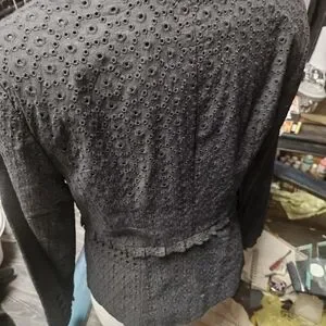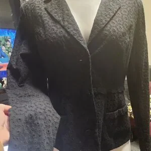 This elegant black eyelet jacket is perfect for adding a touch of sophistication to any outfit. Its intricate design and classic color make it a versatile addition to your wardrobe.