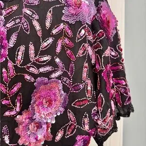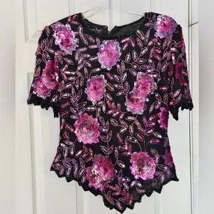 Stunning Vtg Lawrence Kazar Paris~ NY Black Silk Sequin Scalloped Hem Top L