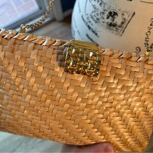Great condition. Lining. Wicker summer clutch with gold chain crossbody. Vintage. Cottage core. Gold latch .