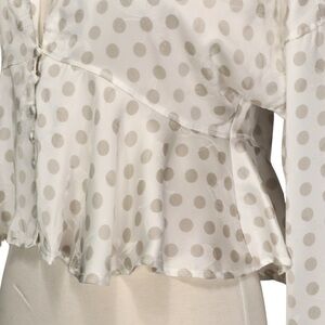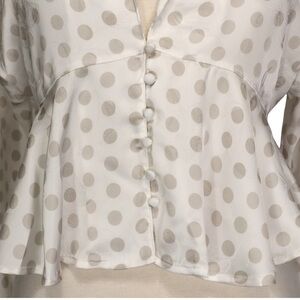 Elegant blouse with polka dots. Features button front and flowy design.