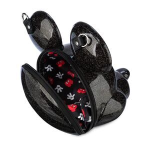 Carry a smile everywhere you go with this Mickey Mouse bag from Loungefly. Fashioned in glitter injected black vinyl, this novel crossbody is molded in the shape of Mickey's fa-mouse face sporting a broad grin. The zip opening reveals a colorful lining featuring Mickey gloves and shorts, while the detachable shoulder strap provides hands-free convenience.