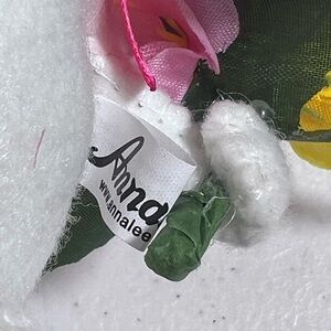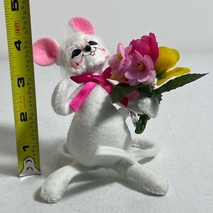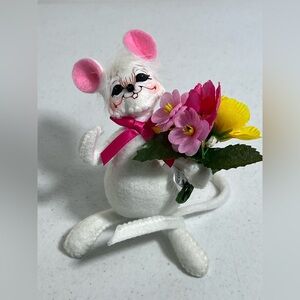 Charming Annalee mouse holding a bouquet. Features pink ears and vibrant flowers.