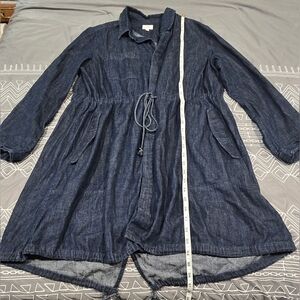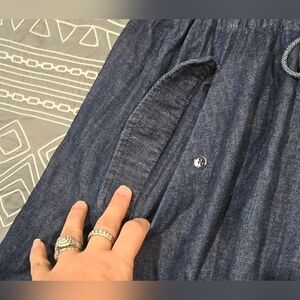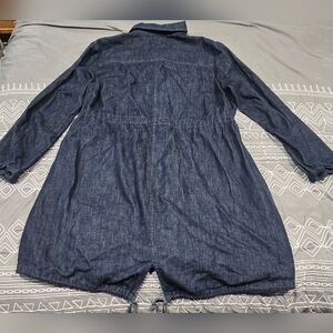 Great condition. Size medium. Denim mini style. Button down closure. Drawstring waist. Side pockets with buttons. Patch chest pocket. Collared. Drawstrings cinching on bottom hem. Mostly worn as dress but also seen styled as a jacket. Measurements and fabric content listed above in pictures.