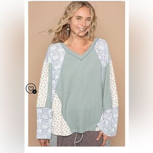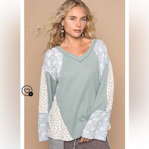 Stylish patchwork V-neck top with mixed patterns and fabrics from POL. Features shades of green, blue, and cream, wide sleeves, and a relaxed fit. Size medium, PTP is 25, length is 27 inches. Purchased new from an online boutique and never worn.