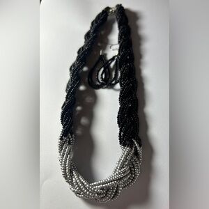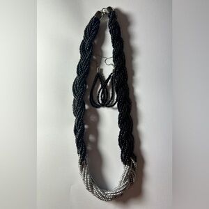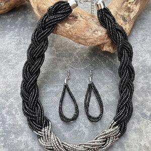 Discover the perfect balance between bold texture and refined sophistication. This handcrafted set features a multi-strand braided necklace in deep obsidian black, transitioning into a luminous metallic silver focal point.