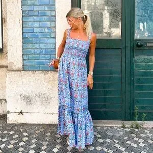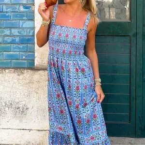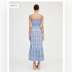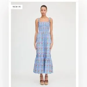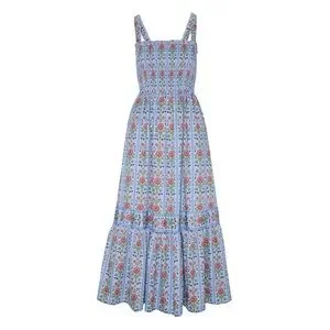 Hill House Anjuli Nap Smocked Cotton Midi Maxi Dress Blue Floral Block Stripe