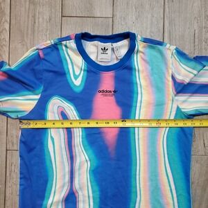 ADIDAS ORIGINALS Men's Hyperreal ALLOVER LOGO TREFOIL SHIRT Sz MEDIUM HN3993. Blue, pink, white, green swirls. Y2k 90s Yeezy vibe