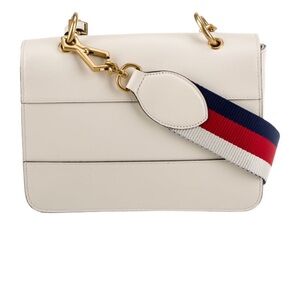 Strap: Detachable "Sylvie" web shoulder strap in signature red, white, and blue.