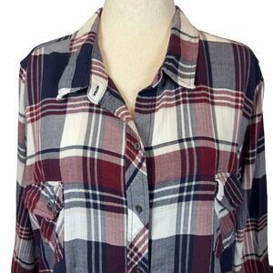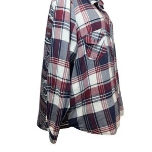 This top features a classic plaid pattern in burgundy, navy, and white on the front and sleeves. The front and sleeves are made of 100% cotton. The back of the shirt showcases a contrasting ornate paisley and geometric print panel with medallions. The back fabric is made of polyester. Two chest pockets with button closures and button cuffs on the sleeves are present.