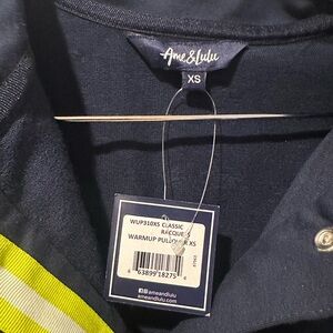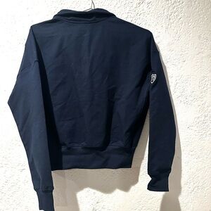 New with tags. Has a small club logo on the sleeve, as noted in the picture. Cropped style with snaps in the front. Stay stylish and comfortable with this navy blue tennis sweatshirt. Perfect for casual outings or a sporty look.