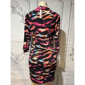 The Vintage Caché dress features a camouflage pattern with a V-neckline and 3/4 sleeves, making it suitable for various occasions such as parties, casual outings, formal events, and business meetings. The knee-length dress is made of polyester and spandex, with a pullover closure and accents like a buckle. With its retro 90s style and multicolor design, this sheath and bodycon dress is perfect for the summer, fall, and spring seasons.