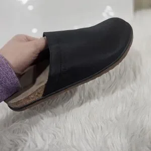 Comfortable black slip-on clogs with a brown sole. Perfect for casual wear.