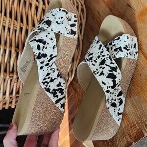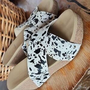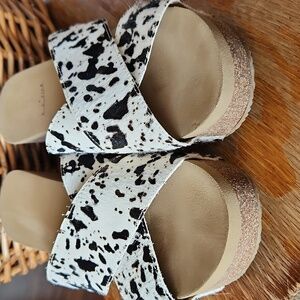 Very Volatile Chocolate Chip Wedge Sandals White Black Sz 8 Cow Hair Print