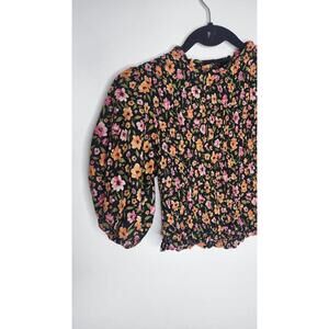 H&M Blouse Womens Small Black Floral Smocked Puff Sleeve Ruffle Hem Keyhole Back