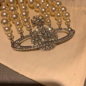 Chic Vivienne Westwood necklace with cream pearls and a silver orb pendant. Ideal for elevating any ensemble.